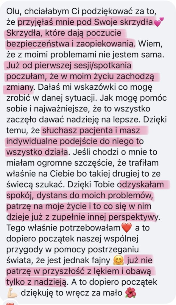 Po pięciu latach pracy w szpitalu klinicznym zdecydowałam się pójść własną drogą i otworzyć prywatny gabinet – tworząc przestrzeń opartą na tym, czego sama kiedyś najbardziej potrzebowałam: zrozumieniu, konkretach i realnych narzędziach zmiany.